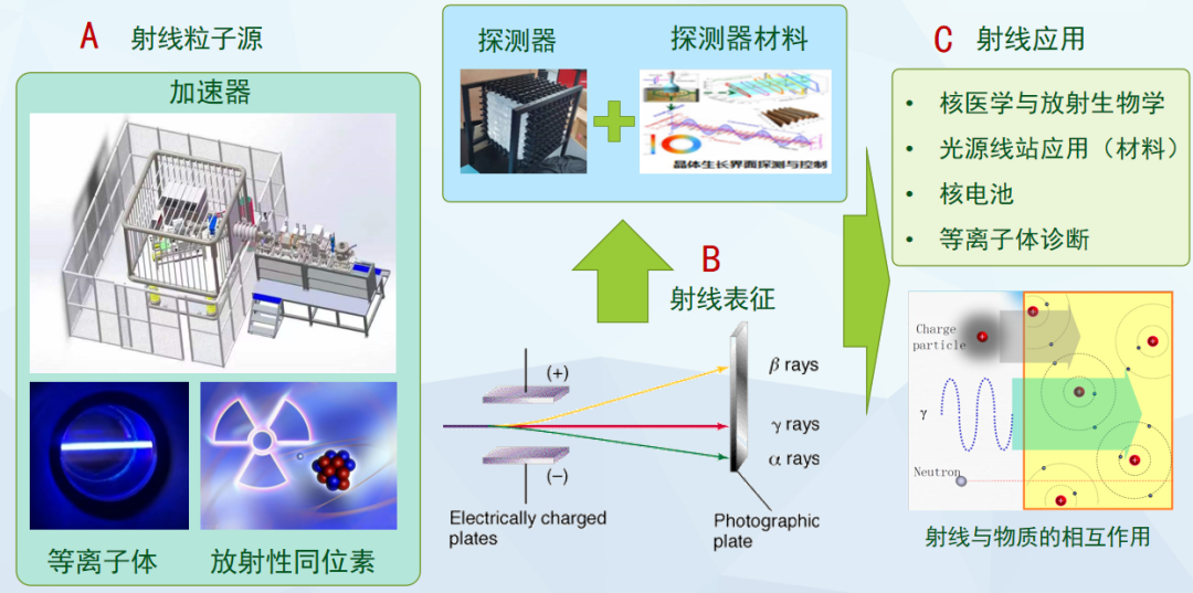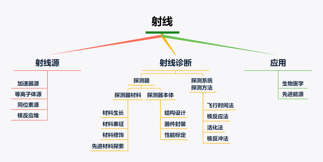 射线与物质相互作用研究概念图(包括射线源、探测诊断、应用技术)