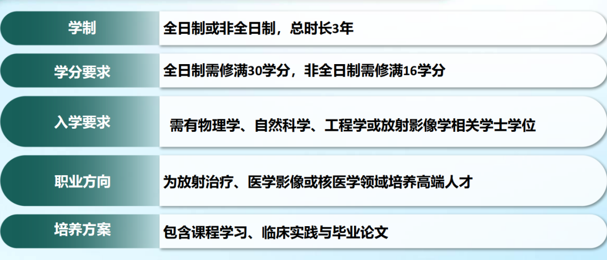 核心课程主要包括:肿瘤放疗物理、放射生物学、放射化学、辐射剂量学、辐射防护、辐射探测、医学统计、医学影像和毕业设计;选修课程有核医学、分子影像、核电子学、加速器物理与技术、深度学习导论、深度学习在医学影像中的应用和临床实践(放疗、核医学、医学影像方向)等。