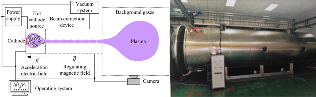 合作单位(陕西省等离子体物理与应用技术重点实验室)的电子束等离子体实验平台示意图及平台真空系统外观